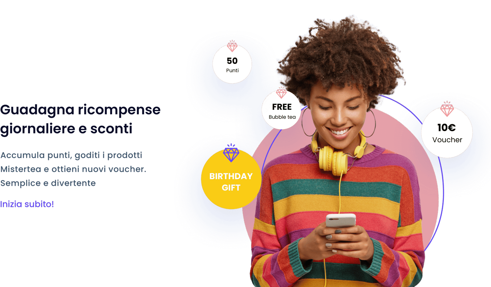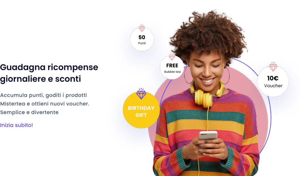 Per iniziare, scarica l’app e iscriviti, avrai subito accesso all’intera gamma di vantaggi Mistertea Loyalty