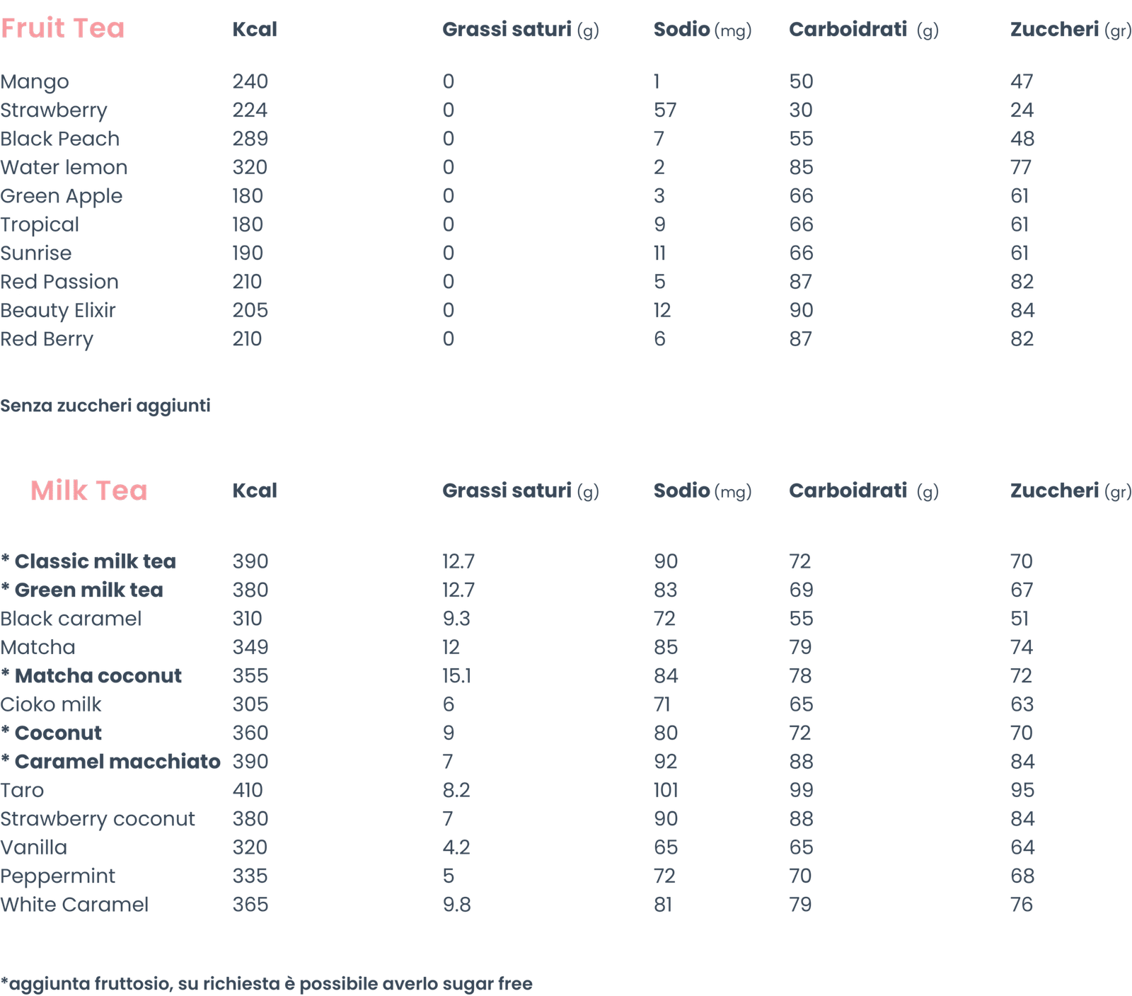 Di seguito trovi le gamme caloriche delle nostre bevande più ordinate. Poichè offriamo molti modi per personalizzare la tua bevanda, ognuna ha una gamma piuttosto ampia in quanto dipende dal livello di dolcezza, dal latte che preferisci e dai topping. L’utilizzo di acqua o latte vegetale apporta un numero di calorie inferiore.